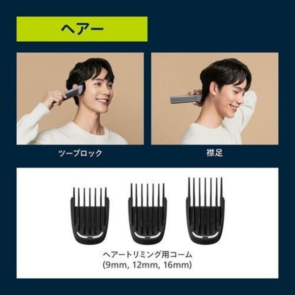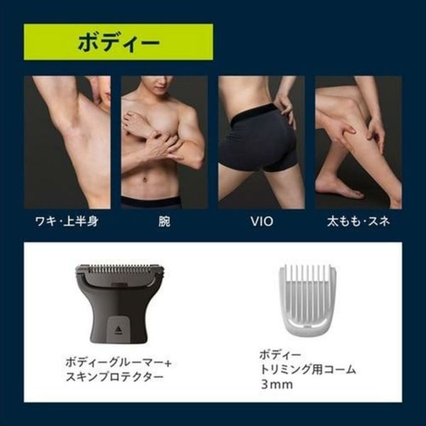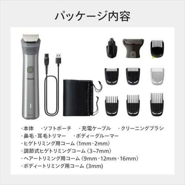【付属品】本体、取扱説明書、ソフトポーチ、充電ケーブル、クリーニングブラシ、鼻毛・耳毛トリマー、ボディーグルーマー、ヒゲトリミング用コーム(1mm)、ヒゲトリミング用コーム(2mm)、調節式ヒゲトリミングコーム(3~7mm)、ヘアートリミング用コーム(9mm)、ヘアートリミング用コーム(12mm)、ヘアートリミング用コーム(16mm)、ボディートリミング用コーム (3mm) |