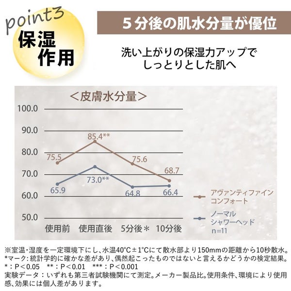 ※保湿作用は室温・湿度を一定環境下にし、水温40℃±1℃にて散水部より150mmの距離から10秒散水。当商品とノーマルシャワーヘッドとの比較。