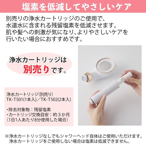 別売りの専用浄水カートリッジ(1本入/TK-T501、2本入/TK-T502)を使用することで水道水の残留塩素を低減させることができます。