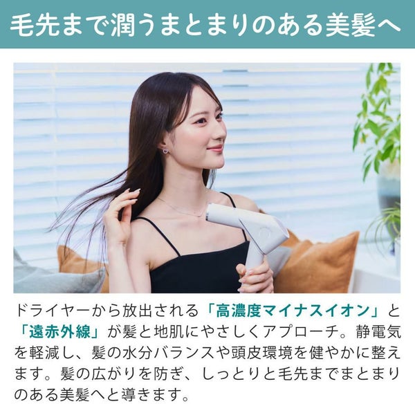 ドライヤーから放出される「高濃度マイナスイオン」と「遠赤外線」が髪と地肌にアプローチ。
