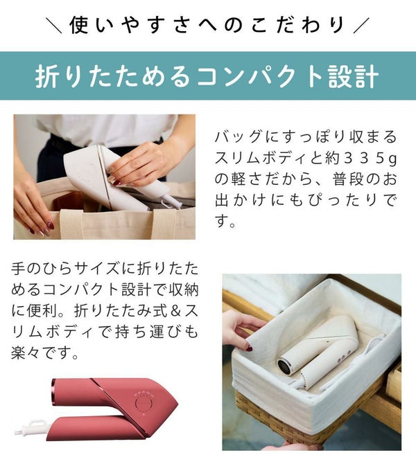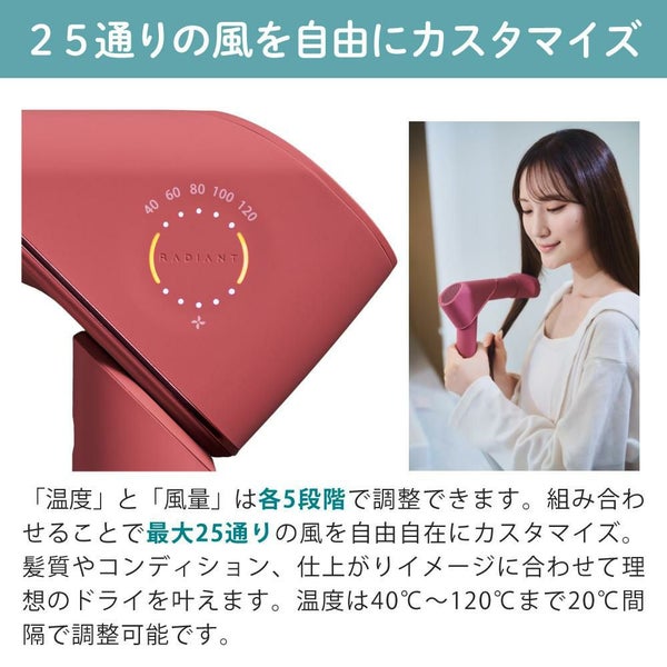 ラディアント シリーズ の 折りたたみ ドライヤー RADIANT LITE は、 美髪 と 使いやすさ を 両立 した 高機能 モデル です。 高濃度 マイナスイオン と 遠赤外線 が 髪 と 地肌 に 働きかけ、 静電気 を 抑えながら 潤い と ツヤ のある まとまり ヘア へ 導きます。 温度調整 と 風量調整 を 各 5段階 で 組み合わせる 25通り の カスタマイズ により、 髪質 や 仕上がり に 合わせた 理想 的 な ドライ が 可能。 温冷切替 を 自動 で 行う ラディアントモード は、 熱ダメージ を 抑えつつ ヘアケア 効果 を 高めます。 折りたたみ 式 の コンパクト 設計 と 約 335g の 軽量 ボディ で、 自宅 用 は もちろん 旅行 や 出張 など 持ち運び にも 便利。 ノーマルノズル と ブラシノズル 付き で、 時短 ブロー と なめらか な 仕上がり を サポート します。