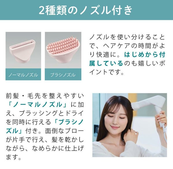 ブローに最適な「ノーマルノズル」に加え、ブラッシングとドライを同時に行える「ブラシノズル」付き。