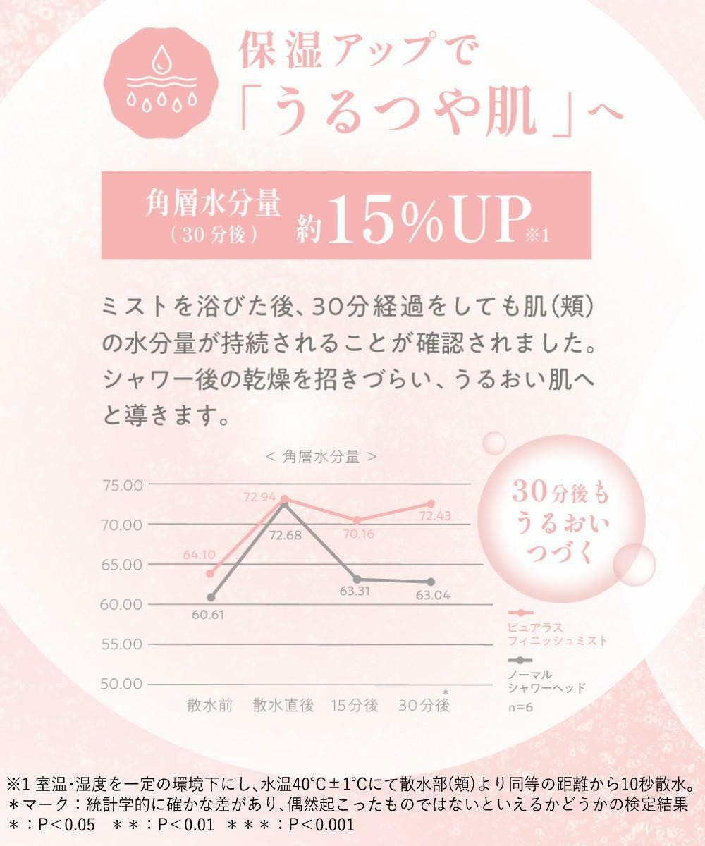 ※角層水分量:室温・温度を一定の環境下にし、水温40℃±1℃にて散水部(頬)より同等の距離から10秒散水。