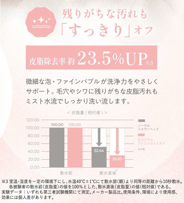 ※皮脂除去率:室温・温度を一定の環境下にし、水温40℃±1℃にて散水部(頬)より同等の距離から10秒散水。各被験者の散水前(皮脂量)の値を100%とした、散水直後(皮脂量)の値(相対値)である。
