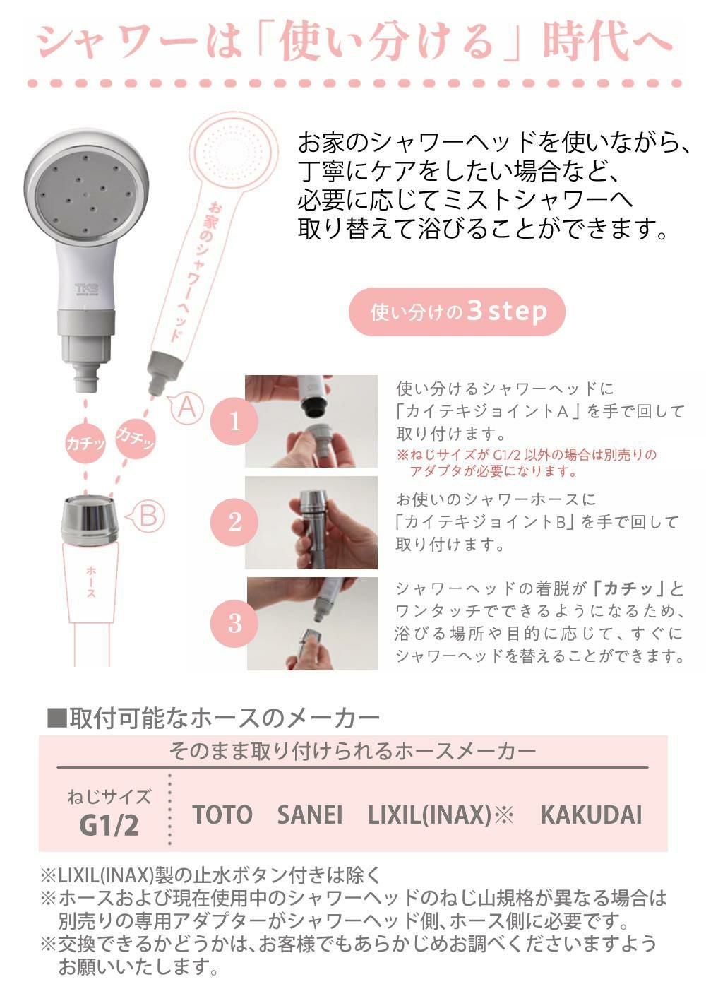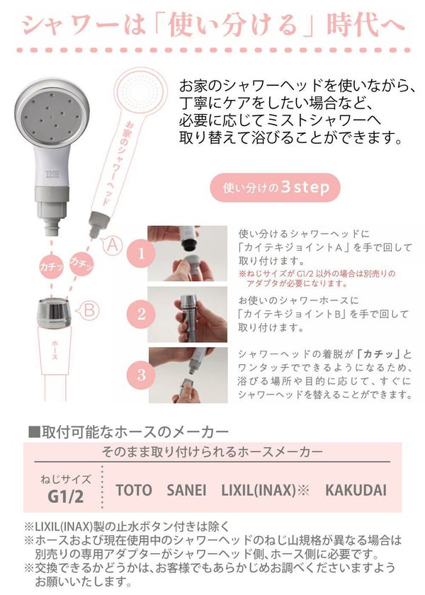 ※ピュアラスフィニッシュミストは「カイテキジョイント」専用のシャワーヘッドです。取り付けには必ず「カイテキジョイント」が必要になりますのでご注意ください。