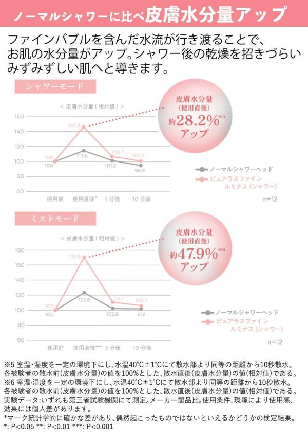 ※ 皮脂水分量(使用直後)は室温・湿度を一定の環境下にし、水温40℃±1℃にて散水部より同等の距離から10秒散水。