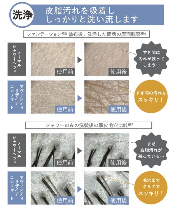 ※7 室温・湿度を一定環境下にし、水温40℃±1℃にて散水部より150mmの距離からシャワー水流+指の腹にて30秒洗髪を行い、その後シャワー水流のみ10秒散水。