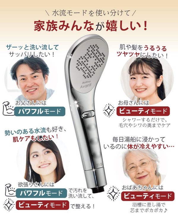 パワフルモードで勢いのある水流、ビューティモードでビューティケア(美容 節水 美肌 保湿 保温)。さらに節水(水道代 節約)も。