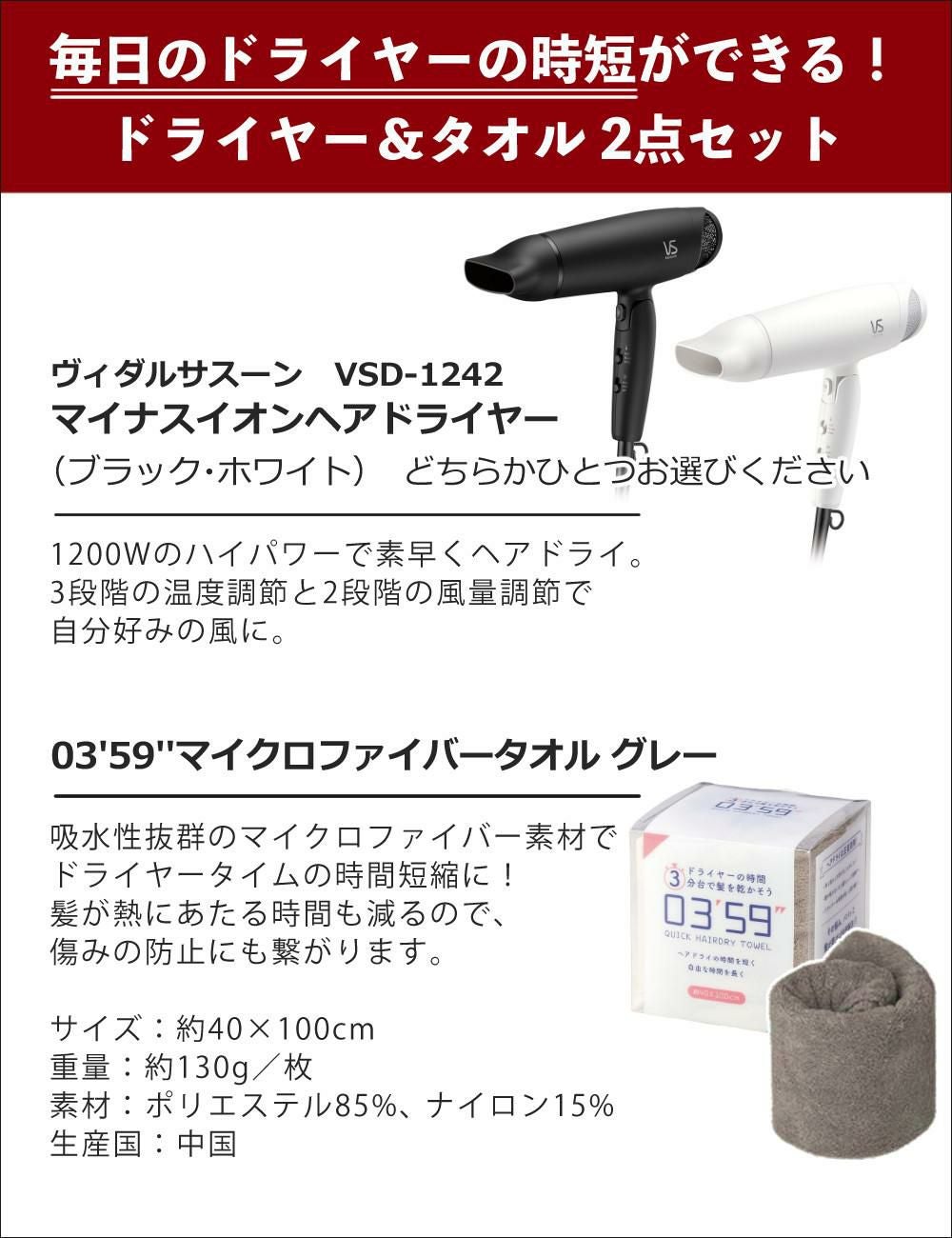 他の画像を見る ヴィダルサスーン マイナスイオンドライヤー 大風量 速乾 静音 VSD-1242KJ VSD-1242WJ VSD1242 ヴィダルサスーン VSD-1242 マイナスイオンドライヤー & 0359 クイックヘアドライタオル グレー (ラッピング不可) 販売価格 ¥ 7,920 税込 カートに入れる お気に入りに登録する (0件)