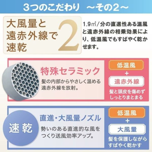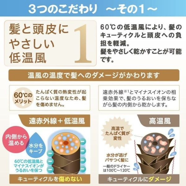 ZD-750W ZD-750P ヘアケアドライヤーは低温風と遠赤外線により髪や頭皮を傷めません。