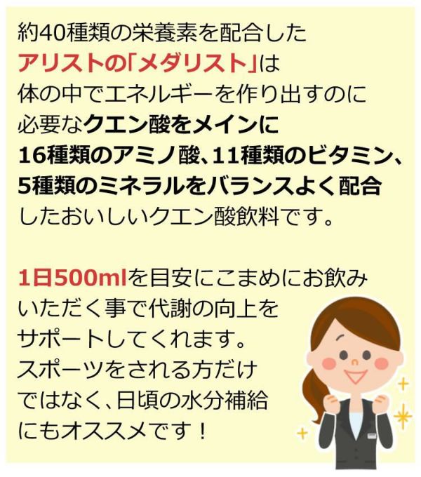 約40種類の栄養素を配合したアリストの「メダリスト」は、体の中でエネルギーを作り出すのに必要なクエン酸をメインに16種類のアミノ酸、11種類のビタミン、5種類のミネラルをバランスよく配合したおいしいクエン酸飲料です。