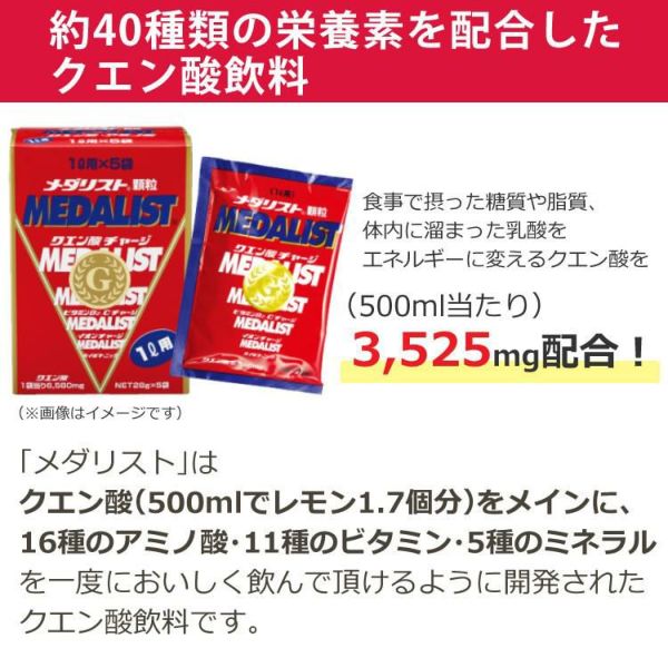 「メダリスト」はクエン酸(500mlでレモン1.7個分)をメインに、16種のアミノ酸・11種のビタミン・5種のミネラルを一度においしく飲んで頂けるように開発されたクエン酸飲料です。