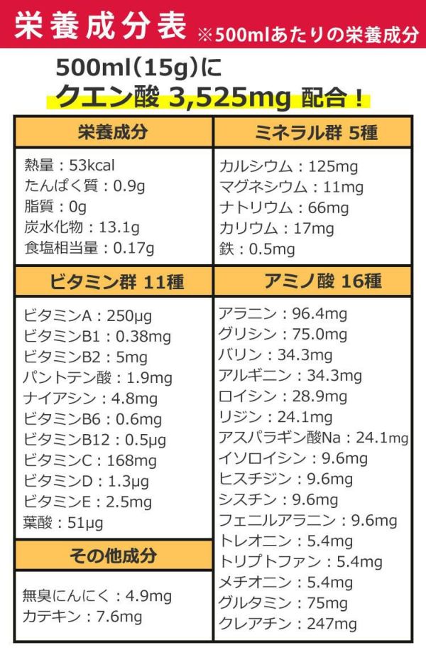 食事で摂った糖質や脂質、体内に溜まった乳酸をエネルギーに変えるクエン酸を(500ml当たり)3,525mg配合!
