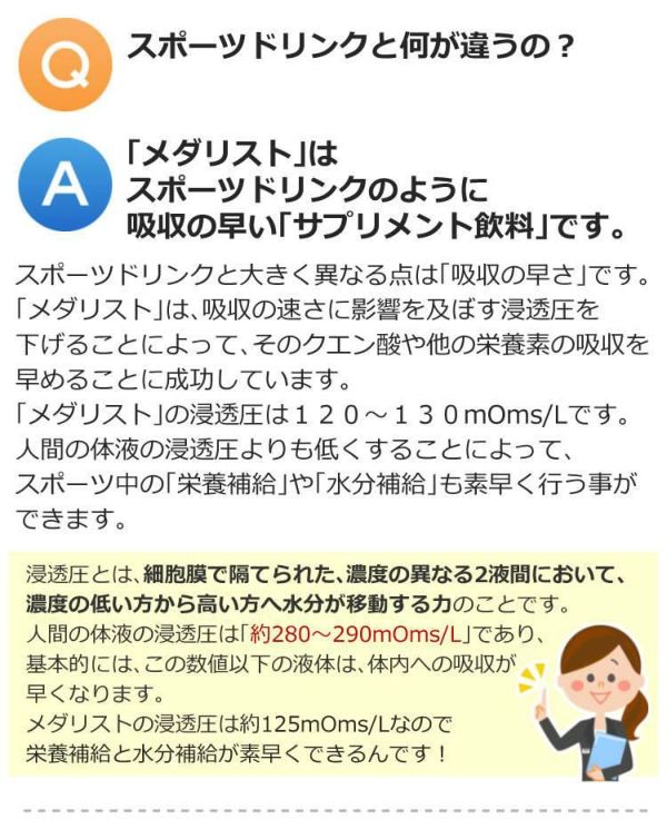 スポーツドリンクと大きく異なる点は「吸収の早さ」です。「メダリスト」は、吸収の速さに影響を及ぼす浸透圧を下げることによって、そのクエン酸や他の栄養素の吸収を早めることに成功しています。「メダリスト」の浸透圧は120~130mOms/Lです。人間の体液の浸透圧よりも低くすることによって、スポーツ中の「栄養補給」や「水分補給」も素早く行う事ができます。