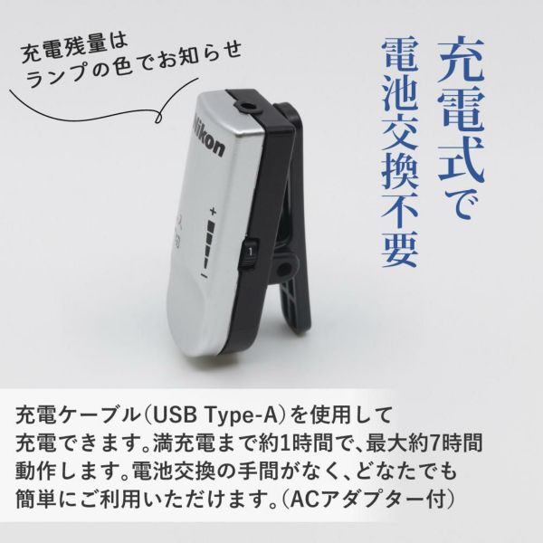 充電ケーブル(USB Type-A)を使用して充電できます。満充電まで約1時間で、最大約7時間動作します。