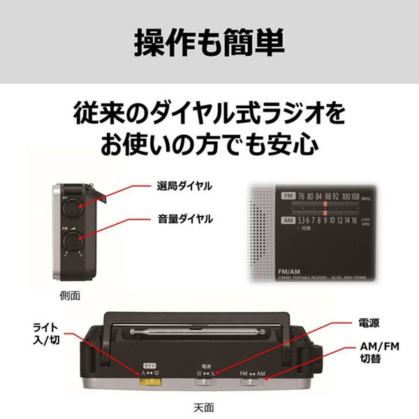 LEDライトを搭載し、暗所や停電時にも安心して使えるホームラジオです。