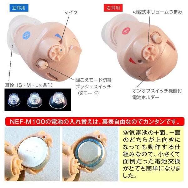 【付属品】本体、お試し用空気電池1個、耳せん(S・M・L×各1個)、携帯用ケース、掃除用ブラシ、取扱説明書、保証書