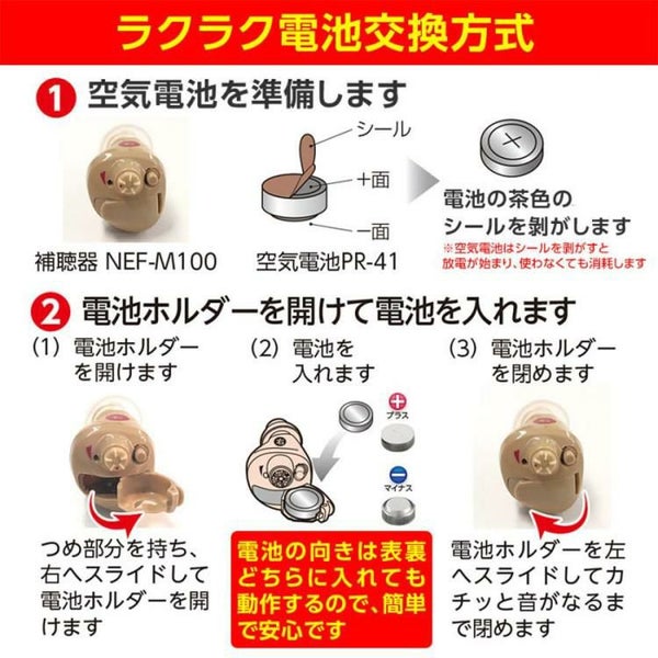 デジタル音声処理による聞こえの最適化はもちろん、大変だった電池交換のお悩みも解消される画期的な「ラクラク電池交換方式」を採用など、補聴器を使う人のことを考え抜いた「耳にやさしく、操作も簡単な設計」になっています。
