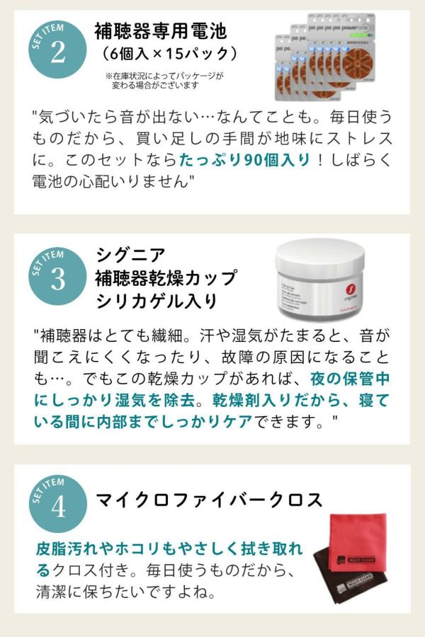 本体、お試し用空気電池1個、耳せん(S・M・L×各1個)、携帯用ケース、掃除用ブラシ、取扱説明書、保証書 |
