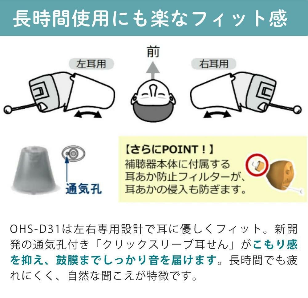 高い評価を頂いているOHS-D21小型形状はそのままに、正面からはほとんど見えないだけでなく、本体重量(電池含まず)『0.9 g』と小型形状。マスクやメガネをしていても着けやすい楽な着け心地の耳あな型補聴器です。
