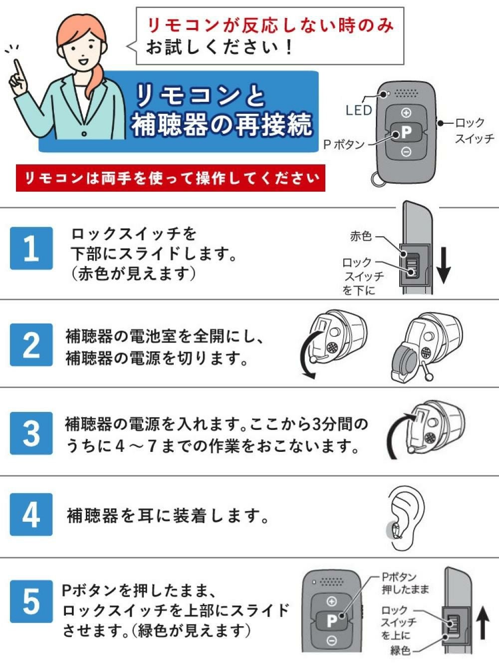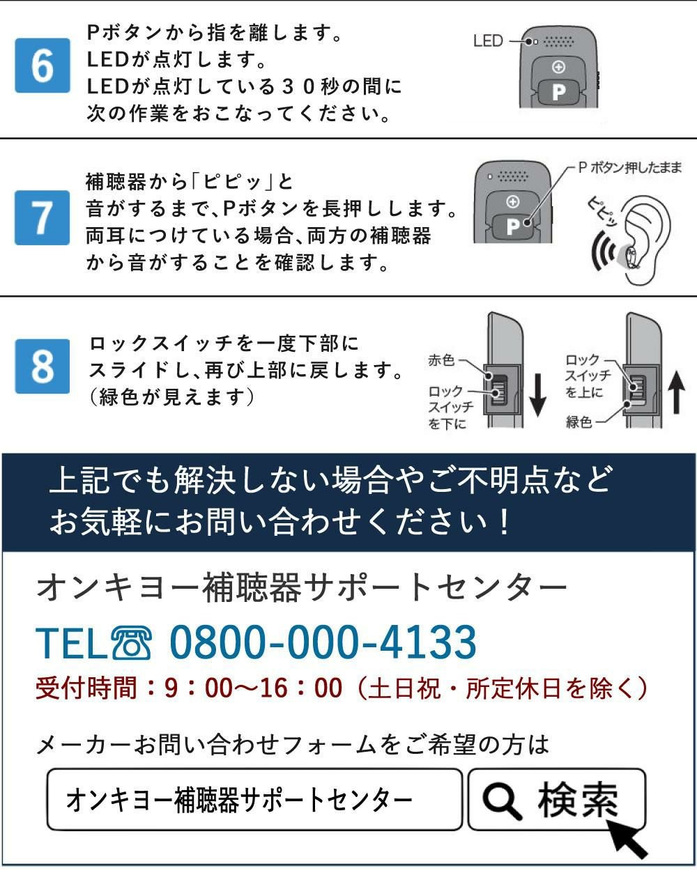 補聴器に電池を入れた後、6秒後に電源が入ります。この間に補聴器を耳にしっかり装着することで、不快なハウリング(ピーピー音)を防ぐ効果があります。