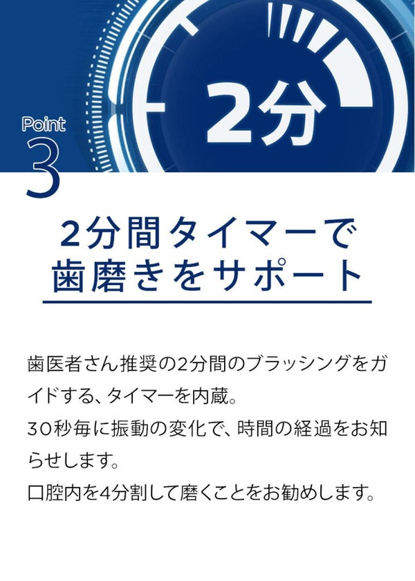ハンドルに内蔵されたタイマーが、次のブラッシング箇所に移るタイミングを30秒毎にお知らせ。