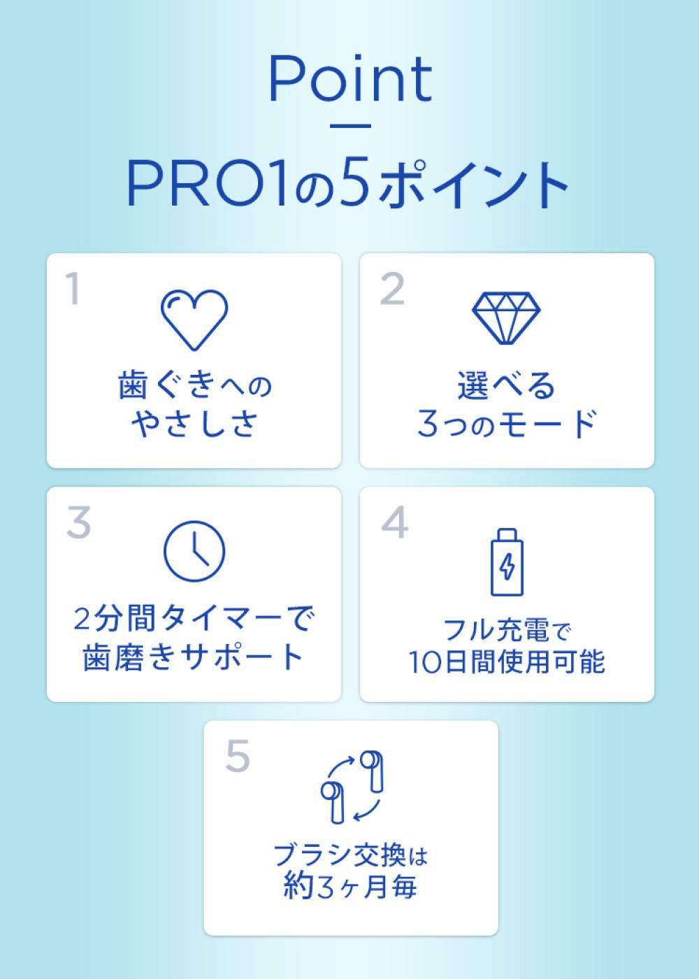 PRO1は、歯科クリーニング器具から着想を得た丸型回転ブラシで、徹底した歯垢除去を実現するシンプルモデルです。