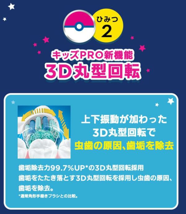 左右の振動に上下振動が加わった3D丸型回転で、虫歯の原因となる歯垢を物理的にたたき落とします。