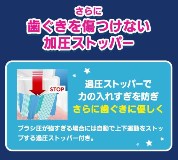さらに過圧ストッパーで力を入れすぎると赤く光ってお知らせし、上下振動をストップ。歯と歯ぐきに徹底して優しい設計です。