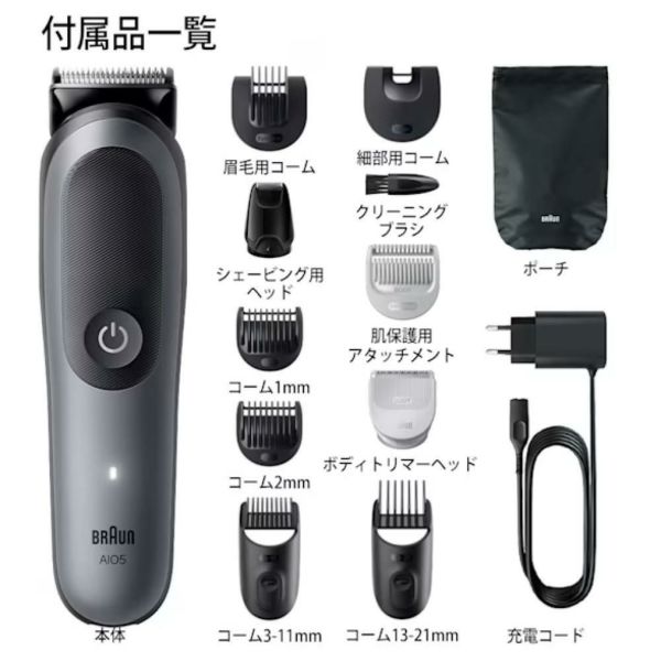 【付属品】ヒゲ用コーム3-11mm、ヘア用コーム13-21mm、シェービング用ー ヘッド、ボディトリマーヘッド、肌保護アタッチメント (ボディ)、長さ調整コーム1mm&2mm、眉毛用コーム、細部用コーム、ポーチ、掃除用ブラシ、スマートプラグ
