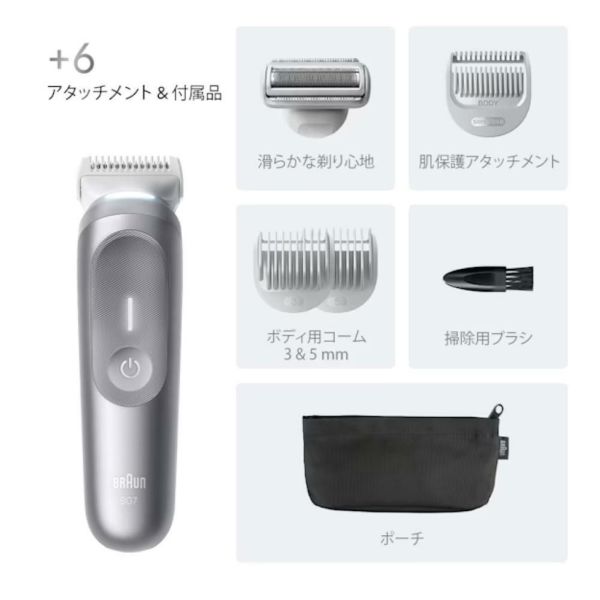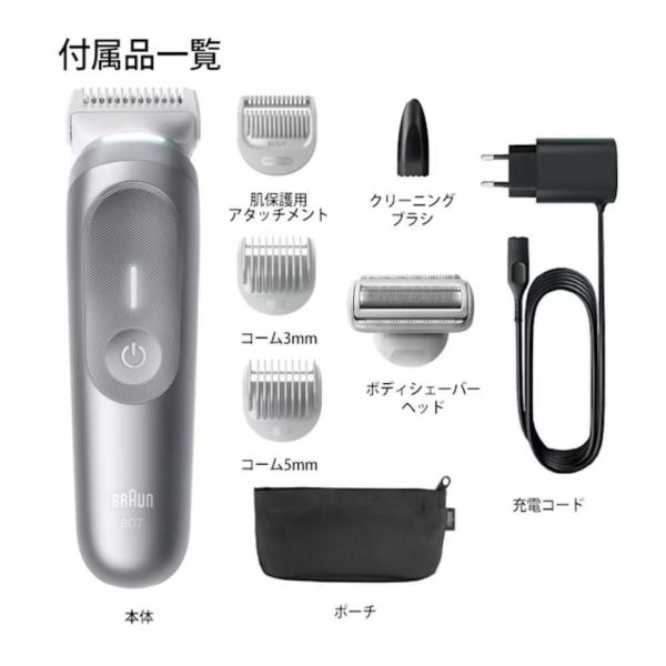【付属品】ボディグルーマーシリーズ7,ボディグルーマーヘッド,肌保護アタッチメント (ボディ),ボディ用コーム3,5mm,ポーチ,掃除用ブラシ,スマートプラグ