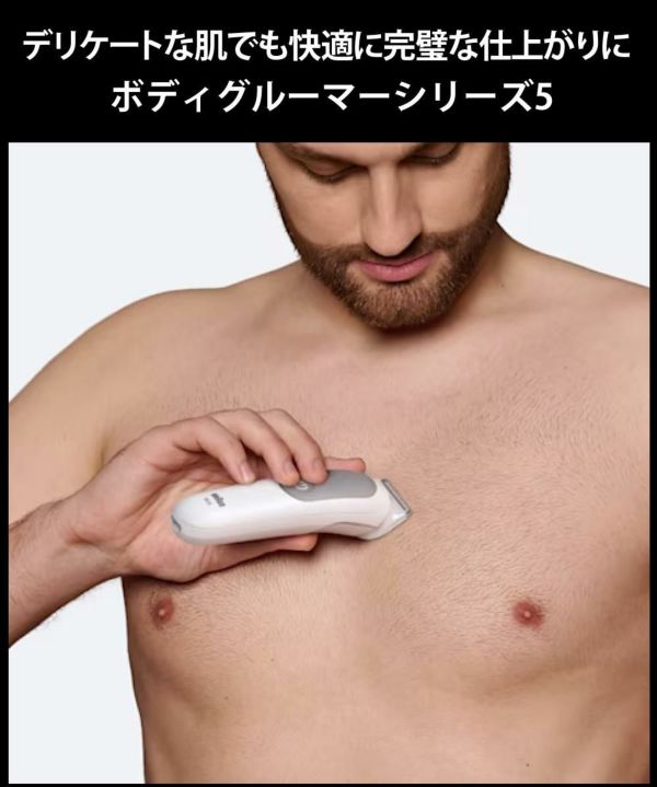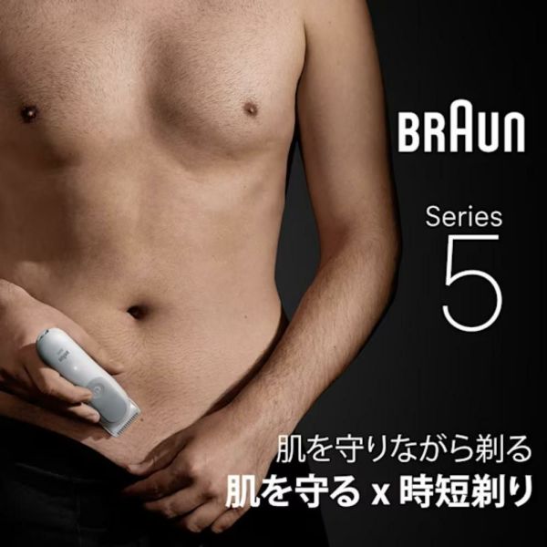 ブラウンの男性用ボディグルーマーシリーズ 5 は、デリケートな肌の部分でも快適です。