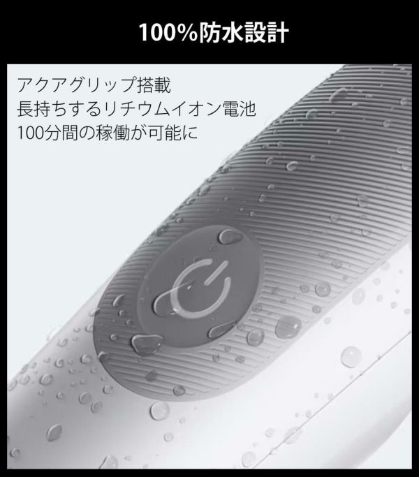 シャワー中でもコントロールできるアクアグリップを備えた 完全防水仕様。100分間使用できる強力なリチウムイオンバッテリーを搭載。