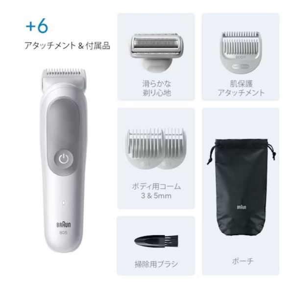 【付属品】ボディグルーマーシリーズ5,ボディグルーマーヘッド,肌保護アタッチメント (ボディ),ボディ用コーム3.5mm,ポーチ,掃除用ブラシ,スマートプラグ
