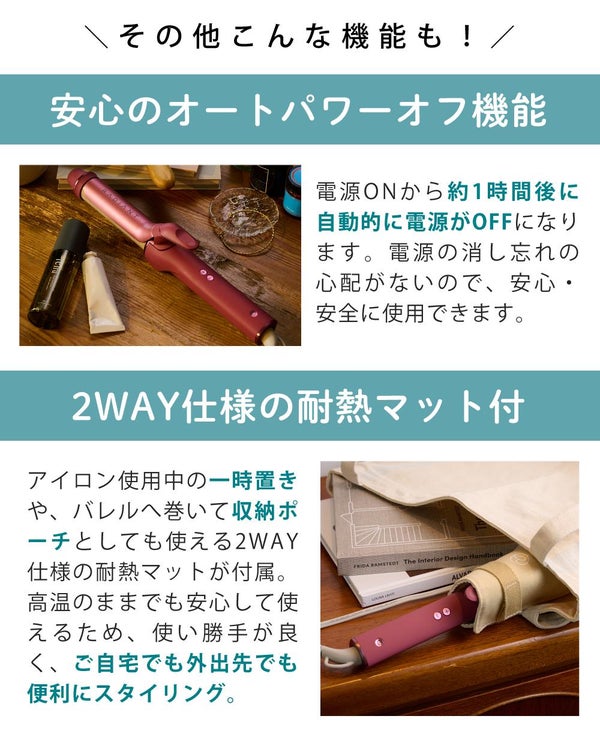 アイロン使用中の一時置きはもちろん、使用後はバレル部分にくるっと巻くだけ。持ち運び用の収納ポーチとしても使える2WAY仕様の「耐熱マット」だから、高温のままでも安心して使えます。