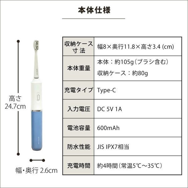 | 重量 | 本体のみ:約105g(ブラシ含む) 収納ケース:約80g |