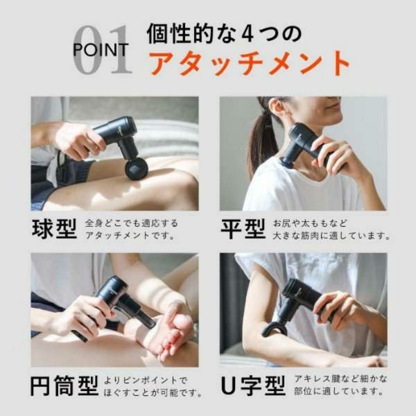 ●大きな筋肉から細かな部位まで、4種のアタッチメントで1台ですみずみまでケア