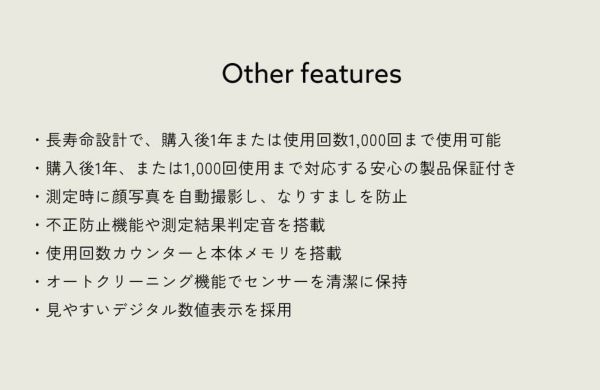 国内唯一のアルコール検知器の業界団体であるアルコール検知器協議会(J-BAC)の認定品です。第三者機関による検定試験もクリアし、安心、安全に高精度でご使用頂けます。