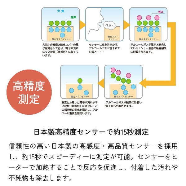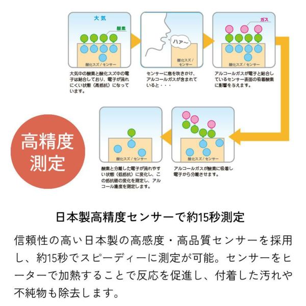 信頼性の高い日本製の高感度・高品質センサーを採用。応答性が早く、迅速に高精度な測定が可能です。また、センサーをヒーターで加熱し反応を促進、さらに加熱することでセンサーに付着した汚れや不純物も除去します。