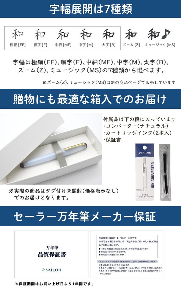 | 付属品 | カートリッジインク(ブラック)2本、コンバーター(ナチュラル)1本、セーラー万年筆保証書 |