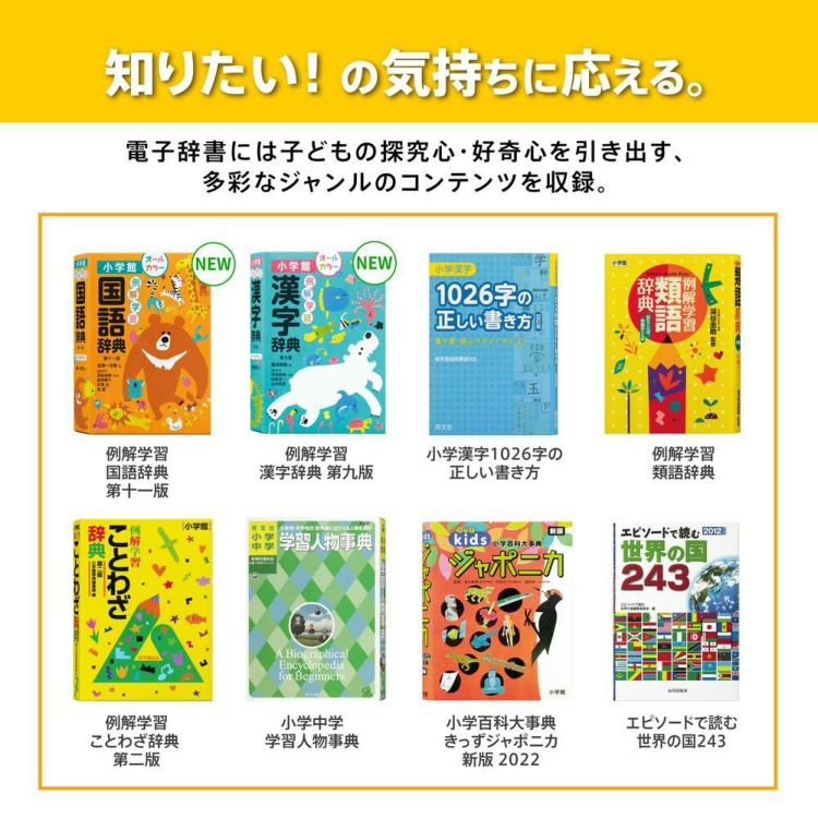 小学生の学習をしっかりサポートできる辞書や百科事典などを収録。読み仮名つきで読みやすい辞書や、イラストやアニメで楽しみながら学べるコンテンツなど小学生の学習レベルに合ったコンテンツが豊富でお子様の学習意欲を育てます。