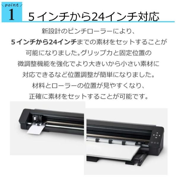 新設計のピンチローラーにより、5インチから24インチまでの素材をセットすることが可能になりました。