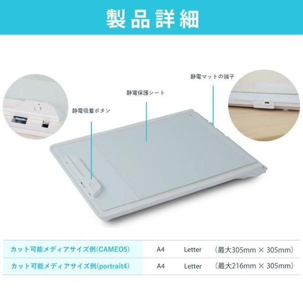 【付属品】カッティング用台紙 レターサイズ、電源アダプタ、オートブレード、刃先キャップ取り外しツール