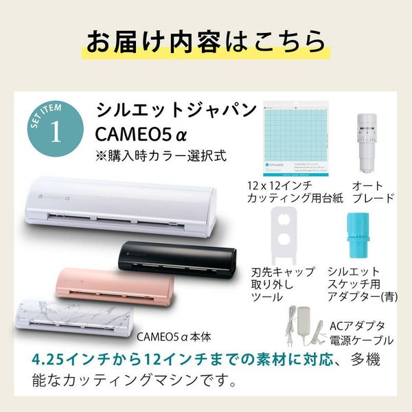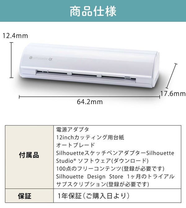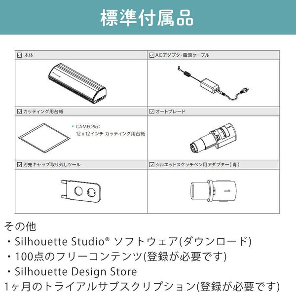 【付属品】電源アダプタ、12inchカッティング用台紙、オートブレード、Silhouetteスケッチペンアダプター、