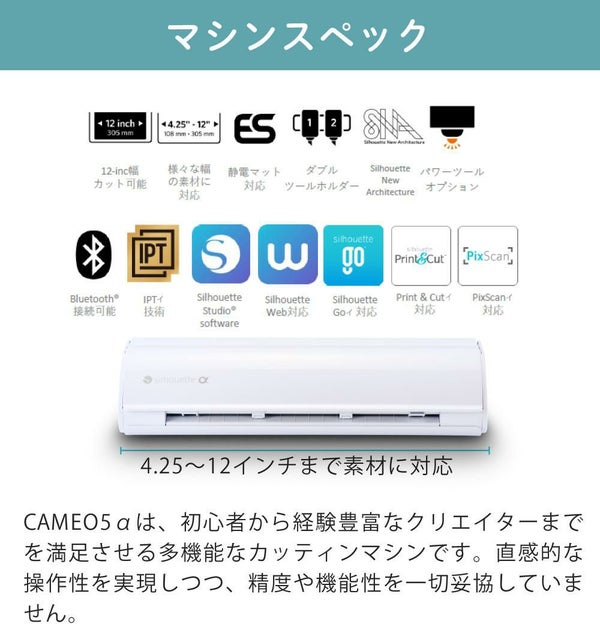 CAMEO5αは5インチから12インチまで、CAMEO5αPLUSでは最大15インチまでの素材がセット可能。