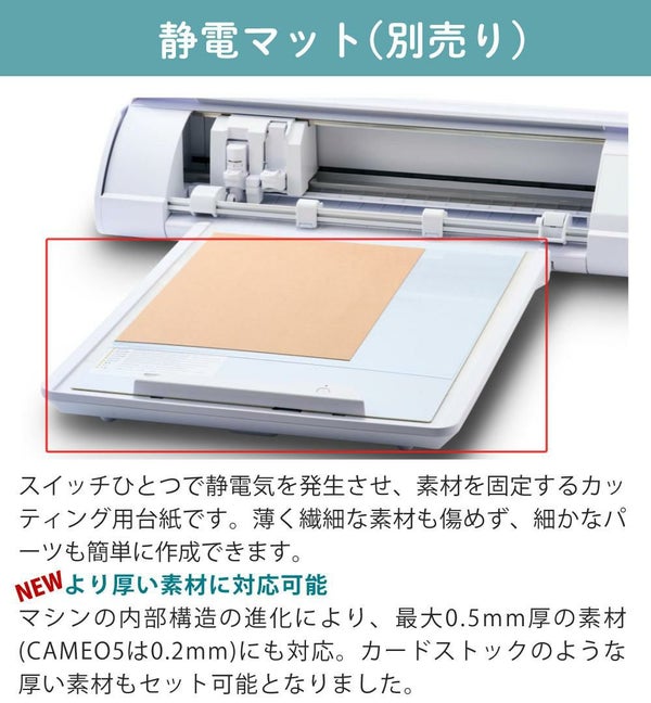 マシンの内部構造の進化により、最大0.5mm厚の素材に対応可能となり(CAMEO5は0.2mm) 、