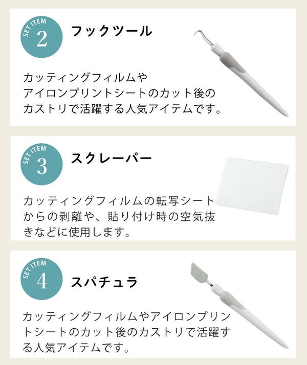 ビニールの転写や気泡除去、余分な素材の削り取りに使えるツールです。