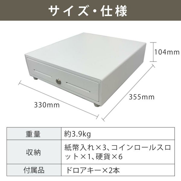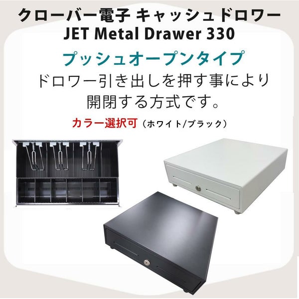 クローバー電子 ドロワー JET Metal Drawer 330 カラーは2色から選択可能です。 ・ホワイト CL00R-2991R JET Metal Drawer 330-W 4562234620660 ・ブラック CL00R-2992R JET Metal Drawer 330-B 4562234620677 ●キャッシュドロアとは キャッシュドロアとは、レジやPOSの紙幣や硬貨、金券等を収納する引出しです。 手動により開閉を行うタイプのドロワーです。 ●プッシュオープンタイプ プッシュオープンタイプは、ドロワー引き出しを押す事により開閉する方式です。