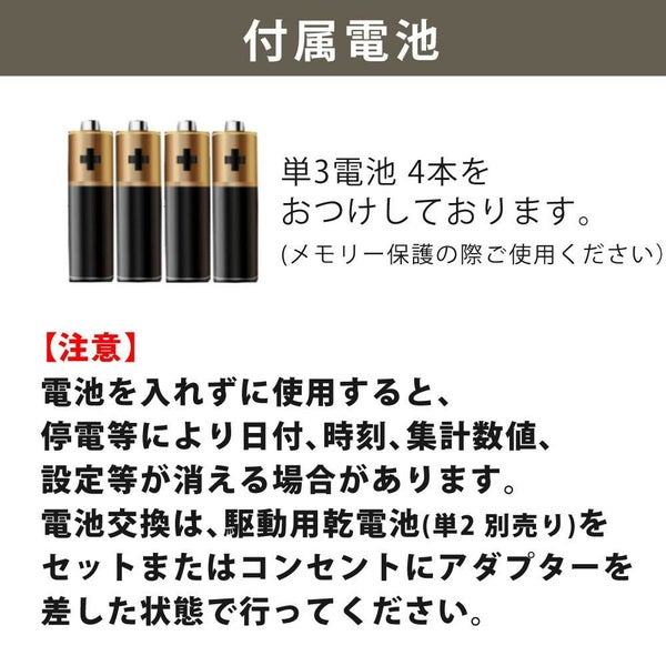 電池を入れずに使用すると、停電等により日付、時刻、集計数値、設定等が消える場合があります。