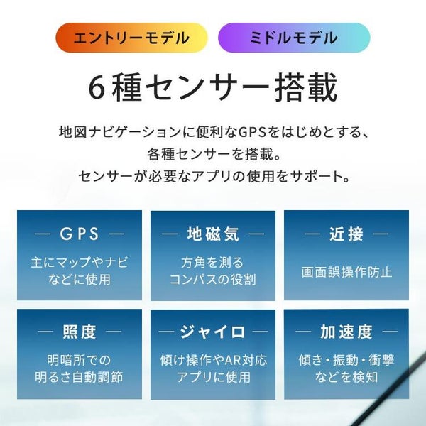 タブレットの使いやすさを重視したセンサーを6種類搭載。